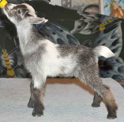 | P62 , polled chocolate and cream buckskin doeling with white |