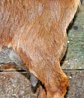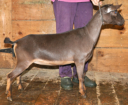 This doe looks so much like her grand dam Chiaroscuro that it is actually a bit eerie. They were both born looking like classic chocolate buckskin, but soon lost all signs of tan markings on the rear, so that the body color appears to be a solid rich dark chocolate.Very similar in body style to Chiara as well, which pleases me no end.